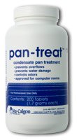 Condensate Pans- If the pan is noticeably fouled, it can be cleaned by using two or more Pan-Treat tablets per ton of system capacity. Repeat until system is clean. For subsequent treatment or clean condensate pans, use one Pan-Treat tablet per ton each month. Position the tablets away from the drain and where they will achieve maximum contact with dripping condensate. This will assure more complete cleaning action and treatment. For larger systems, where the use of many tablets may be impractical, use Nu-Calgon's PanPads condensate pan products.