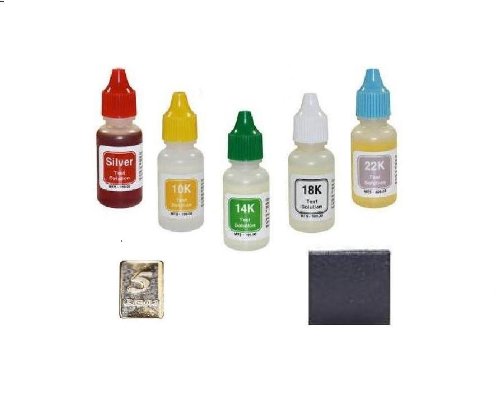 Very easy to use and includes instructions. Sealed box contains fine (5) bottles test solution; each bottle contains 1/2 fluid oz (0.5 fl oz) test acid. You will receive one 10k solution, one 14k solution, one 18k solution, one 22k solution, and one Silver solution--each new in box sealed with shrink-wrap. Test stone is top quality, brand new, and will last many uses. Use the FREE solid silver sample to demonstrate test procedure, or keep as investment. Very easy to use. Popular among professionals, hobbyists, coin enthusiasts, business owners, and students alike. Excellent tools. Excellent Value.